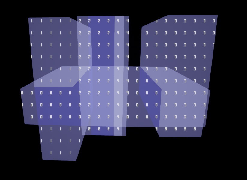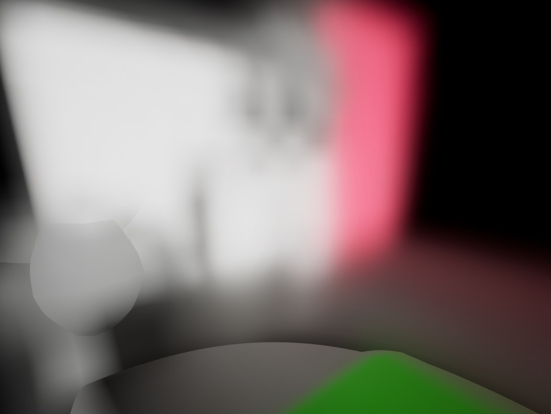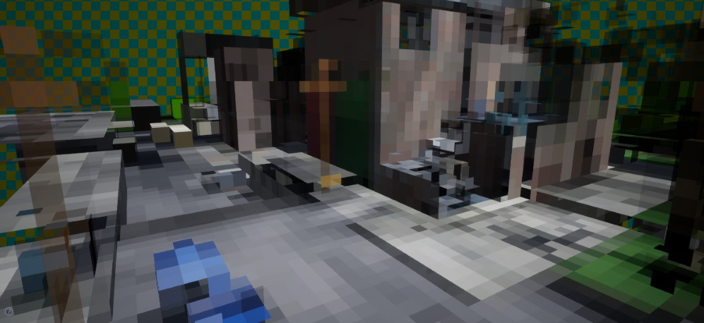 Voxel bit 블록은 8x8x8 블록에서 주어진 복셀이 비어있는지 아닌지 여부를 위해 voxel 당 1 비트에 저장됩니다. 그리고나서 우리는 2 단계의 DDA 알고리즘을 사용하여 그들을 ray marching 하였습니다. 투명한 면을 가진 voxel 은 유사하지만, 단일 단계의 DDA 만 있었고 ray 를 따라서 투명도를 누적하였습니다. 두 접근법 모두 distance field 보다 geometry 를 표현하는 것이 덜 효과적이고 빈 공간을 건너뛰는 것도 잘 되지 않아서 상당히 느렸습니다.