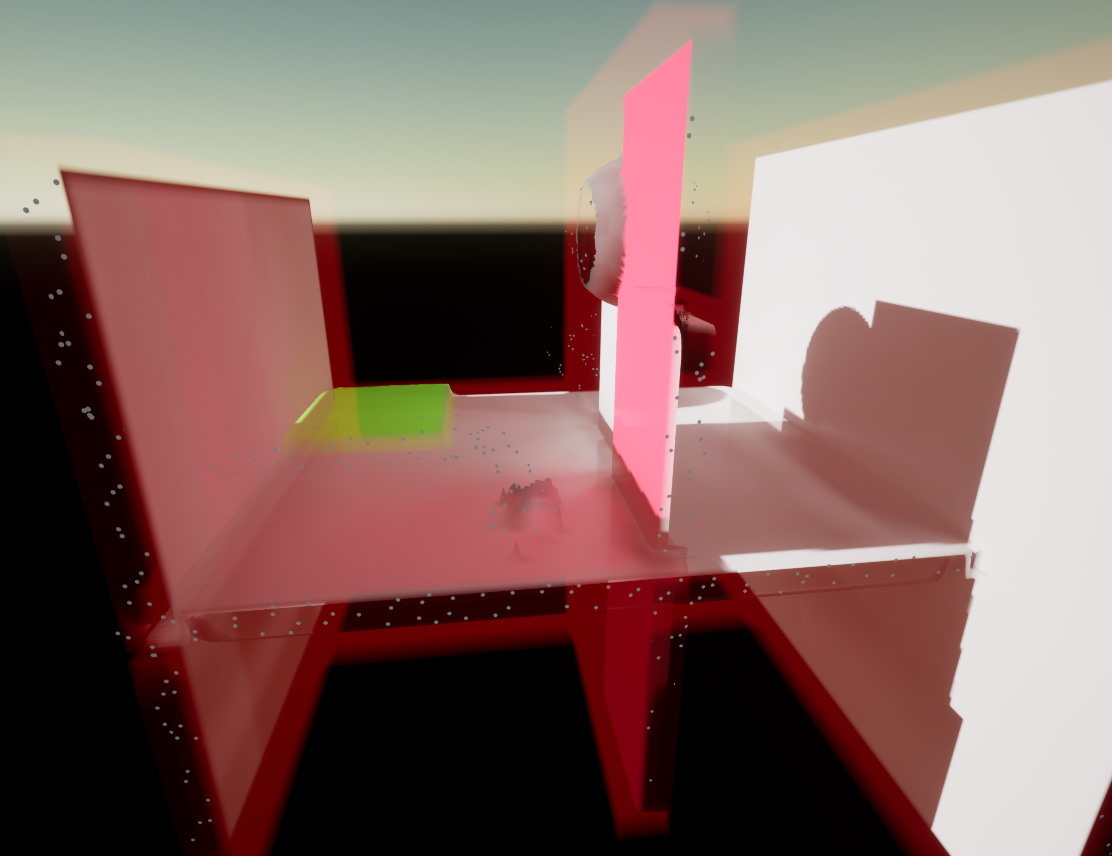 우리의 해결법은 card 가 겹치지 않는다고 가정하고 오클루젼을 누적하는 것입니다, 왜냐하면 우리는 누출(leaking) 되는 것 보다는 과도하게 오클루젼되는 것을 더 낫다고 생각하기 때문입니다. Radiance 누적에 대해서 우리는Weighted Blended OIT 를 사용하였습니다. 흥미롭게도 Weighted Blended OIT 는 넓은 Depth 범위 때문에 Primary ray에서 상당한 양의 누출(leaking)이 발생한 반면 짧은 GI ray에는 잘 동작했습니다.