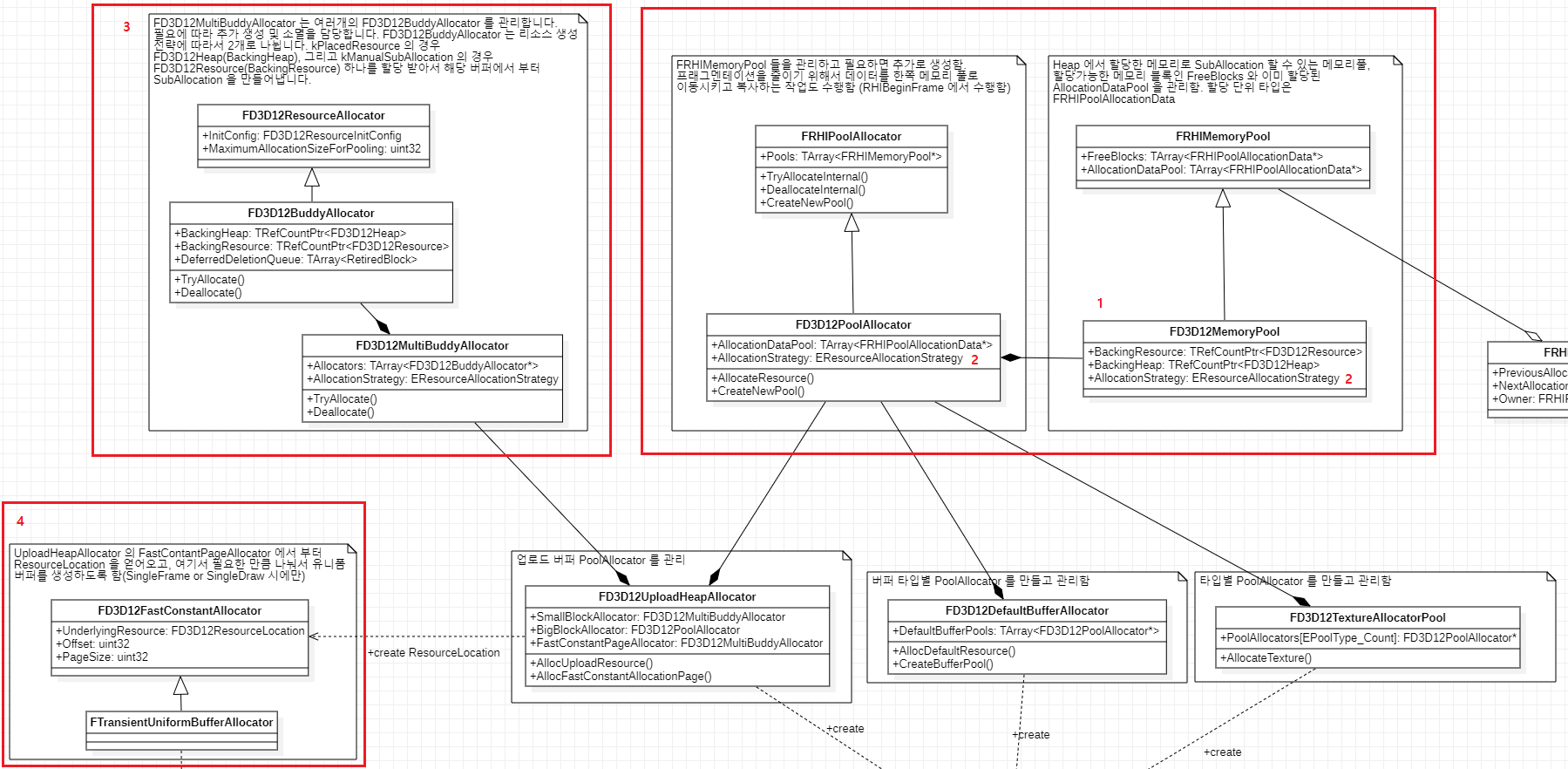 - 실제로 ID3D12Heap 를 가지는 것은 FD3D12MemoryPool 입니다. FD3D12PoolAllocator 는 여러 개의 FRHIMemoryPool 을 필요에 따라 생성/해제시킵니다.