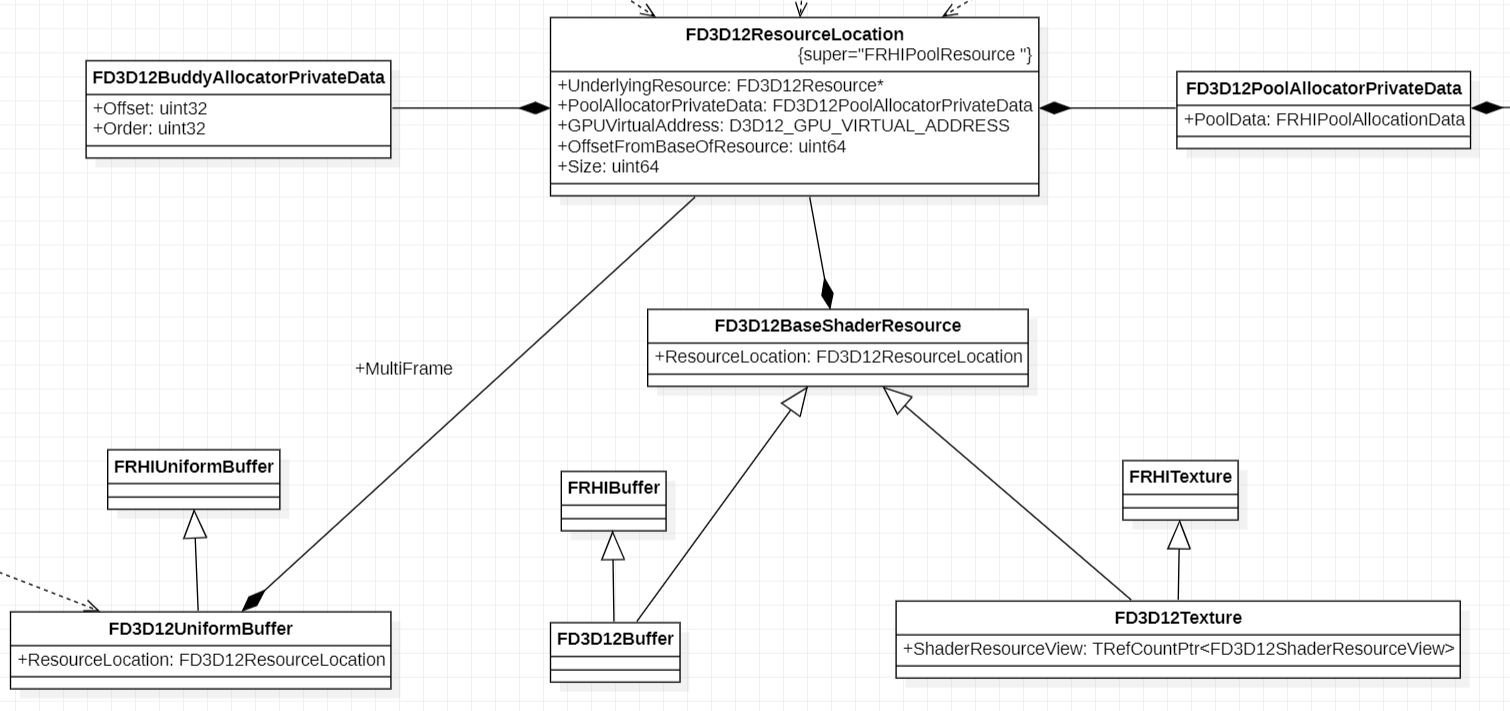 FD3D12Buffer, FD3D12Texture, FD3D12UniformBuffer 가 ID3D12Resource 를 어떻게 소유하는지 알아봅시다. 그림1 을 보면 FD3D12ResourceLocation 가 실제로 할당된 ID3D12Resource 를 갖고 있는 것을 볼 수 있습니다(FD3D12Resource 에 있음). Buffer, Texture 의 경우는 FD3D12BaseShaderResource 를 상속하는 형태로 FD3D12ResourceLocation 를 가집니다. 그리고 FD3D12UniformBuffer 의 경우는 직접 FD3D12ResourceLocation 을 소유합니다. FD3D12ResourceLocation 은 자신이 ‘어떤 Allocator(Buddy or Pool) 에서 할당되었는지?’ 에 대한 정보도 가지고 있습니다. 이 정보를 기반으로 메모리를 해제 방식을 결정합니다.