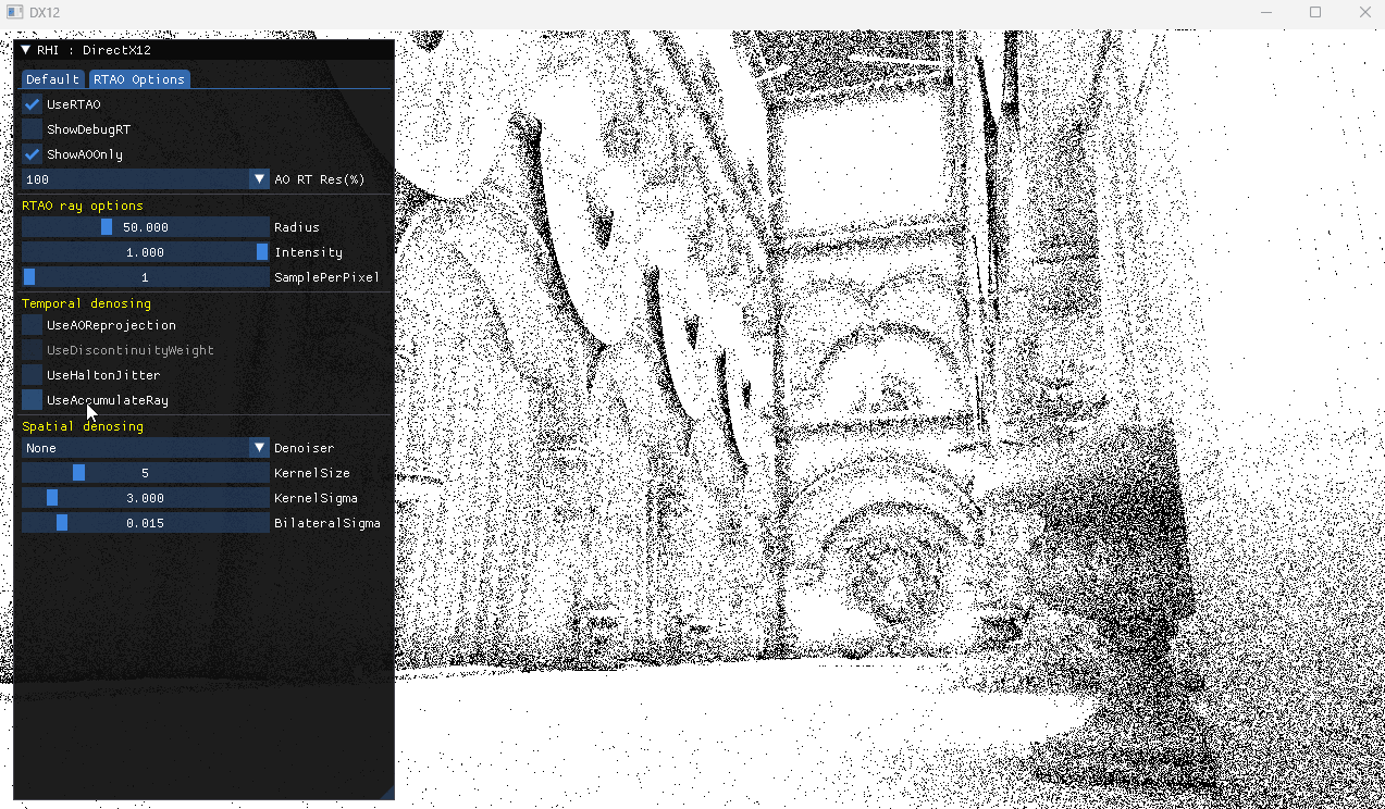아래 동영상은 옵션을 변경하면서 AO 적용 결과를 확인해 본 것입니다. Denosing 이 모두 적용된 경우 AO 렌더타겟을 50%(가로세로를 절반으로 줄여서 1/4 크기)로 한 경우도 Noise 가 크게 눈에 안 띄는 것을 볼 수 있습니다.