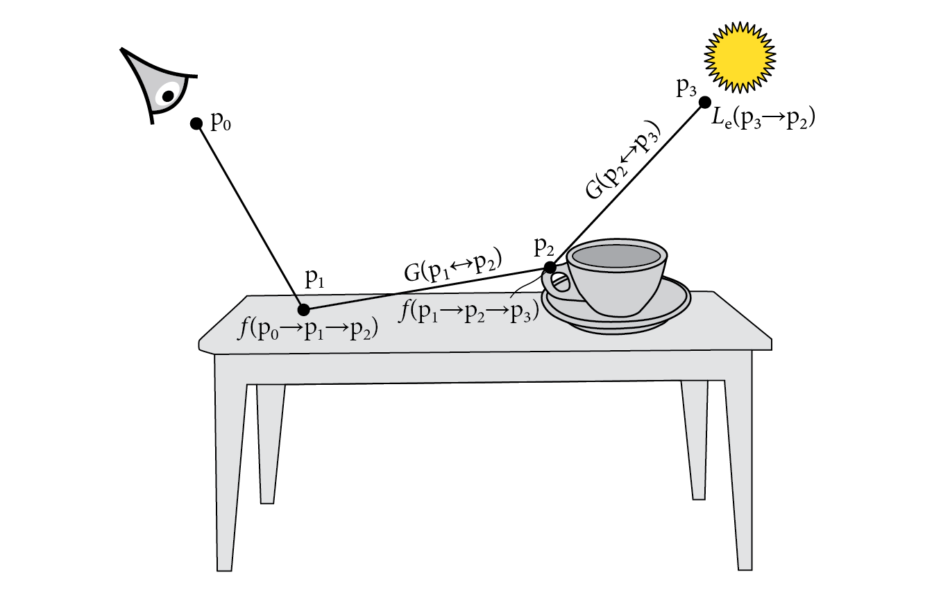 먼저 PathTracing 에 대해서 알아봅시다. PathTracing 은 눈에서부터 광원까지의 경로를 추척해가며 최종적으로 눈으로 들어오는 Radiance 를 평가합니다. Radiance 를 평가하는 동안 다양한 재질을 거쳐서 광원으로 이동하게 되며, 이 재질들은 각각의 특성에 따라서 빛을 특정 범위로 산란시킬 것입니다. 아래 그림1을 봐주세요. 그림1은 여러 산란 경로 중 하나를 보여줍니다. 눈과 광원인 P0, P3 를 제외한 P1, P2 에서는 재질에 따른 산란이 발생합니다. 리얼타임 렌더링에서 한 프레임에 이 수많은 경로를 모두 평가할 수 없기 때문에 PathTracing 에서는 경로에 대한 평가들을 매프레임 계속 누적합니다.