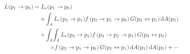 P1 점에서 P0(눈) 으로 들어오는 Radiance 를 계산하기 위해서는 P2, P3 에서 들어오는 Radiance 정보 또한 모두 모아야 합니다. 그림3 은 거기에 대한 식을 보여줍니다.