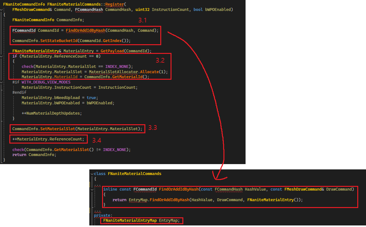 3.1. 로빈후드해시맵에 FMeshDrawCommand 해시를 기반으로 FNaniteMaterialEntry 를 등록합니다. 등록 후 돌려받은 해시키를 CommandInfo 저장합니다. 이 키는 CPU 에서 FNaniteMaterialEntry 를 찾을 때 사용됩니다.