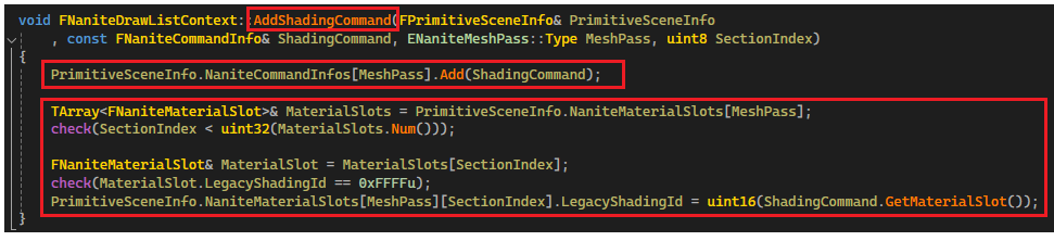 AddShadingCommand 함수는 PrimitiveSceneInfo 에 Nanite 관련 정보를 기록하는데 사용됩니다. 그림6의 3번 과정에서 생성한 FNaniteCommandInfo 를 PrimitiveSceneInfo 에 등록하고, PrimitiveSceneInfo.NaniteMaterialSlots 에 MaterialSlot 또한 기록합니다. MaterialSlot 은 그림7의 3.2 과정에서 생성한 GPU 에서 사용할 Material Index 입니다.