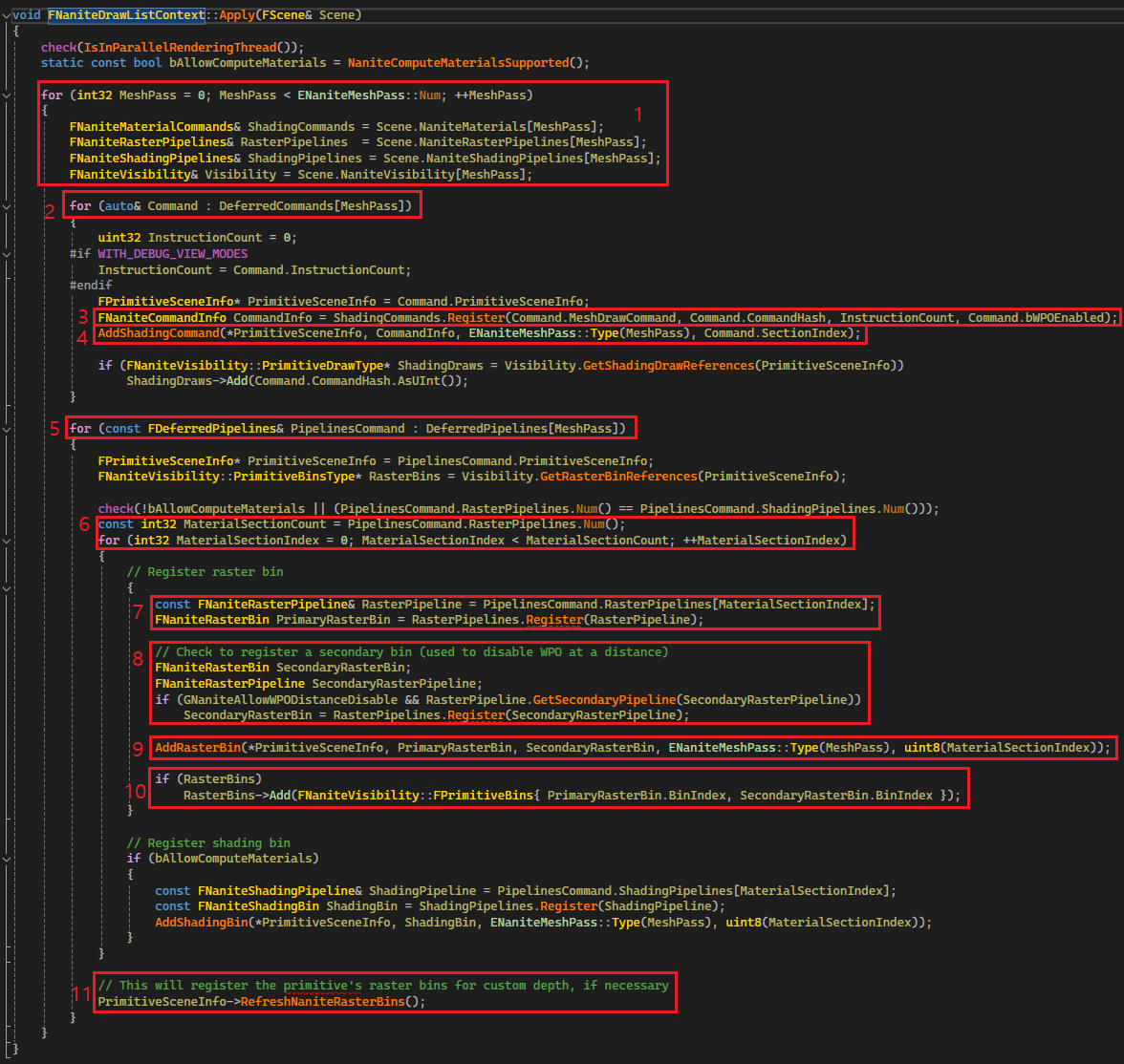 1. FNaniteDrawListContext 의 Apply 함수 내부입니다. 모든 ENaniteMeshPass 에 대해서 순회합니다. ENaniteMeshPass 는 BasePass 와 LumenCardCapture 두 가지입니다. 이제 MeshDrawCommand 를 만들면서 준비한 머터리얼 파이프라인 데이터들을 FScene 에 등록합니다. FNaniteMaterialCommands 는 머터리얼 슬롯 정보, FNaniteRasterPipelines 은 Rasterize 관련 머터리얼 정보, FNaniteShadingPipelines 는 Shading 관련 머터리얼 정보를 담고 있습니다.