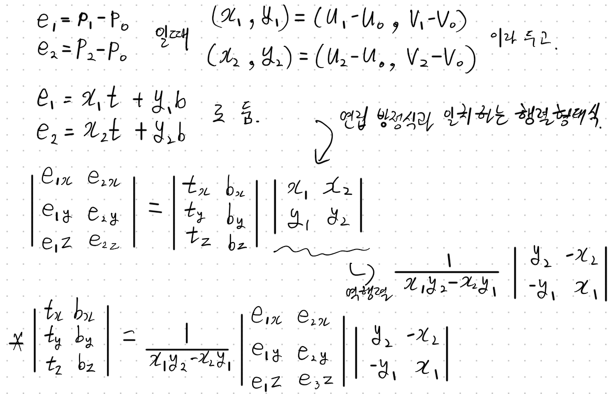 아래의 그림처럼 2개의 점을 사용해 얻은 벡터를 T와 B 를 기저로 하는 벡터 공간에서 표현 할 수 있다는 점으로 T, B 벡터를 유도할 것입니다.