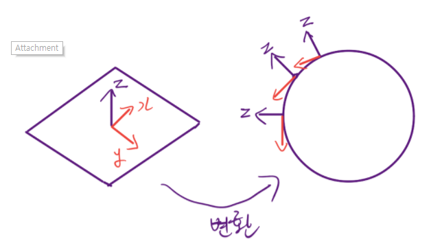 텍스쳐에 있는 Normal을 오브젝트의 표면에서 사용하려면, 텍스쳐 공간에서 오브젝트 공간으로의 공간변환이 필요합니다.