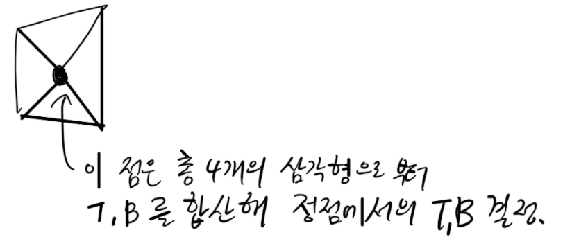 얻어진 T, B 벡터는 이 정점을 공유하고 있는 모든 삼각형들의 T, B 벡터와 합산하여 계산합니다.