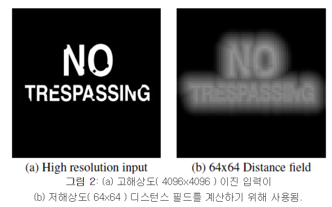 1. 고해상도 (예를들면 4096x4096) 이미지 에서 SDF 를 생성합니다. 이때 생성한 SDF는 저해상도 입니다.