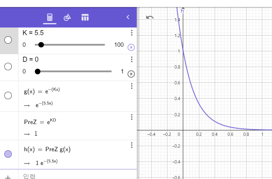 Geogebra에서 exp(k*z) * exp(k*d) 를 사용해보면 아래와 같은 결과를 얻을 수 있습니다. 결과를 한번 분석 해봅시다.