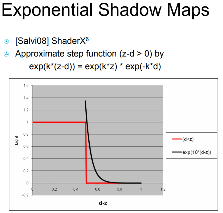 ESM의 또다른 특성으로 exp(k*(z-d)) = exp(k*z) * exp(k*d) 처럼 식을 분리할 수 있는점 입니다. Shadow map에 Depth 값으로 exp(k*z)를 저장하고, 실제 Shadow를 드리울때는 exp(-k*d) 값을 생성하여 Shadow map의 exp(k*z)와 곱하여 Lit 여부를 판정합니다.