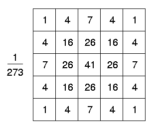 가우시안 스무딩의 아이디어는 2D 분포를 점확산(point-spread) 함수로 사용하는 것입니다, 그리고 이것은 convolution으로 이루어집니다. 이미지는 개별의 픽셀의 모음으로 저장되어지므로 우리는 우리가 convolution을 수행하기 전에 가우시안 함수에 대해서 개개별로 근사를 생성해야 합니다. 이론에서, 가우시안 분포는 모든 곳에서 0이 아닙니다, 그것은 무한하게 큰 convolution 커널을 요구할 것입니다, 그러나 실제로는 대략 평균으로 부터 3개의 표준편차 보다 더 큰것은 0으로 합니다. (it is effectively zero more than about three standard deviations from the mean), 그리고 우리는 이 점에서 커널 잘라낼 수 있습니다. 그림3은 적절한 정수값으로 된 a가 1.0에서의 가우시안 근사의 convolution 커널을 보여줍니다. 가우시안을 근사하기 위해서 어떻게 mask의 값을 선택하는지는 확실하지 않습니다. Mask 픽셀의 가운데에서 가우시안의 값을 사용할 수 있습니다, 그러나 이것은 정확하지 않습니다. 왜냐하면 가우시안 값은 픽셀에서 비선형으로 변하기 때문입니다. 우리는 전체 픽셀에 가우시안의 값을 통합할 수 있습니다.(0.001 을 가우시안에 더해주므로써). 전체 합은 정수값이 아닙니다: 우리는 코너 값이 1을 갖도록 배열을 재조정합니다. 끝으로, 273이 Mask의 모든 값의 합입니다.