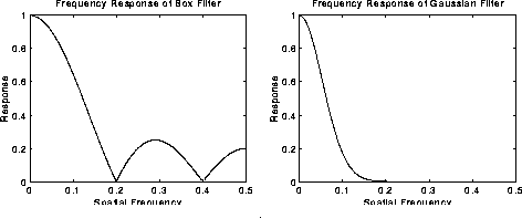 두 필터 모두 저 주파수들 보다 고 주파수를 감쇄시킵니다, 그러나 평균 필터는 그것의 주파수 응답에서 진동을 나타냅니다. 반면에 가우시안은 진동을 보여주지 않습니다. 실제로, 주파수 응답 곡선의 모양은 그것 자체가 (절반) 가우시안 입니다. 그래서 적절한 크기의 가우시안 필터를 선택하므로써 우리는 필터링(이경우 평균 필터가 아님) 후의 이미지에서 어떤 범위의 공간 주파수들이 여전히 남아있을 것인지 확신할 수 있습니다. 이것은 Zero Crossing 섹션에서 언급한것 처럼 몇몇의 에지 검출 기술에 영향을 주었습니다. (가우시안 필터는 Canny 에지 검출 유도에 사용된 기준에 따라 에지 검출을 위한 최적화된 스무딩 필터와 유사한 것으로 밝혀졌습니다.)