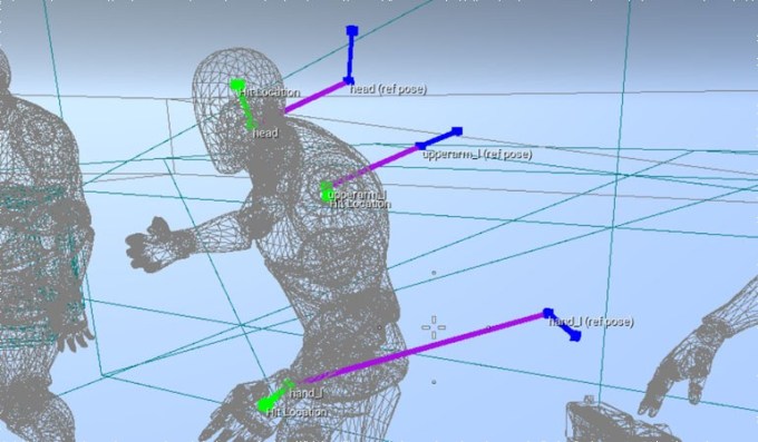 이것이 히트 위치(녹색)과 현재 포즈의 변환 그리고 히트된 본에 변환이 적용된 것을 시각화한 것입니다. 그리고 파랑색 선이 레퍼런스 포즈 변환과 일치하는 것입니다. 보락색 선은 차이를 보여주는데 도움을 줍니다.