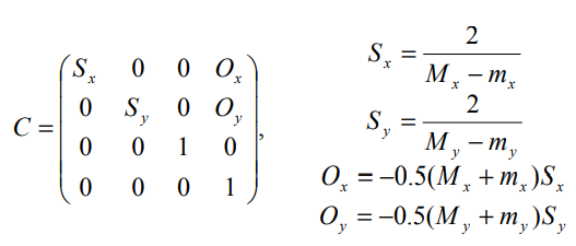 그동안, 라이트의 모델뷰 매트릭스 M은 라이트의 방향을 바라보게 설정되고 일반 Orthogonal 프로젝션 매트릭스 P=I로 설정됩니다. 그리고 나서, 카메라 프러스텀 슬라이스의 코너의 점 P는 라이트의 동차좌표 공간에서 ph=PMp로 투영된다. 바운딩 박스의 각 방향에서 최소의 mi와 최대 Mi 값은 라이트 프러스텀(box)에 정렬되어있습니다. 그리고 일반적인 라이트 프러스텀이 정확히 일치하도록 scaling과 offset을 결정합니다. 이것은 crop 매트릭스 C를 만들어서, 우리가 최고의 z에서의 정밀도를 얻도록 해주며 x, y에서 가능한 적은 정밀도를 잃도록 해줍니다. 최종적으로 라이트의 프로젝션 매트릭스 P는 P=CPz로 수정됩니다. Pz는 Near과 Far 평면이 mz 와 Mz인 Orthogonal 매트릭스입니다.