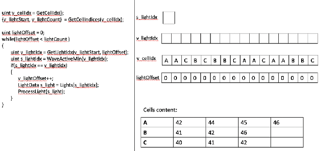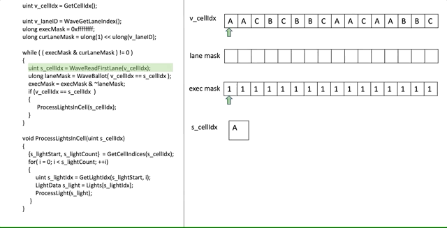 명백히 우리는 필요한 경우만 라이트로 쉐이딩을 하고싶습니다! 만약 현재 스레드의 첫번째 처리되지 않은 라이트가 전체 wave에서 가장 작은 인덱스와 같다면, 우리는 계속해서 그런 라이트를 SGPR에서 처리할 것입니다.