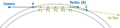 이제 이 식들로 적분 구간을 어떻게 구해내는지 알아봅시다. 카메라가 우주에 있는 경우 대기와 교차하는 점 A와 B를 구해냅니다. 우주공간에서는 산란이 일어나지 않기 때문에 아래와 같이 산란이 발생하는 2개의 지점을 구하는 것입니다. 그리고 계산을 간단히 하기위해서 샘플링할 지점을 선택합니다. 샘플링한 지점에서의 적분 연산은 샘플 구간길이를 곱하여 ("점 Pn에서 구해진 산란값" * (AB의 길이 / n)) 해당 샘플 구간에서의 산란양을 구합니다.