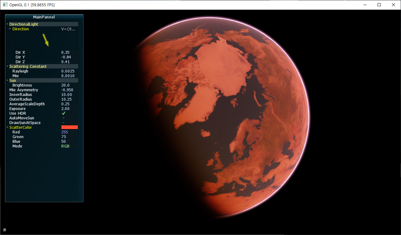 이 알고리즘은 흡수와 산란 알고리즘을 행성의 대기에 적용한 것이 차이점입니다. 흡수와 산란 공식에서는 라이트가 매질을 통과할 때 입자의 밀도(대기의 밀도)가 동일하다고 가정합니다. 하지만 행성에서 대기는 지상에서 우주방향으로 이동할 수록 줄어들게 됩니다. 흡수와 산란 공식이 이 부분을 반영한 부분이 기존 흡수와 산란 공식과 가장 큰 차이점입니다.