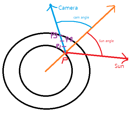 // 라이트와 샘플포인트 사이각, 그리고 카메라와 샘플포인트의 사이각을 구함. 이때 샘플포인트는 원점에 있다고 가정한 위치
