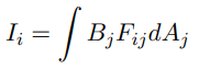 우리 모델의 주어진 표면(폴리곤)에서 우리는 Radiosity 항을 표면을 떠나는 단위 면적당 에너지로 정의할 수 있습니다. 그것은 폴리곤 표면 전체로 상수가 아닐 것입니다. 그것은 방출된 에너지와 (만약에 있다면) 반사된 에너지의 합니다. 표면의 작은 영역 dA는(이곳에서 방출된 에너지는 상수로 취급할 수 있습니다) 아래와 같습니다: