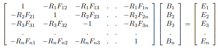 여기서 합은 i를 제외한 모든 패치를 사용합니다 (혹은 Fii=0으로 설정하고 모든 패치들의 합으로 해도 됩니다). 만약 우리가 모든 Bi에 대해서 이 문제를 풀 수 있다면, 올바른 라이트 모델로 각 패치를 직접 렌더링 할 수 있습니다. 식에서 B 값은 패치를 렌더링 하는 데 사용하는 실제 색상입니다, 그래서 B, E 그리고 R 모두는 RGB 컬러 이미지에 대한 3차원 벡터의 양입니다. 폼팩터는 각 RGB 차원에 대해 동일합니다. 우리는 아래의 매트릭스 방정식으로 문제를 공식화할 수 있습니다.