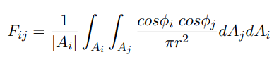 폼팩터는 모든 패치 쌍을 연결하고, 한쪽에서 다른 한쪽에 도달하는 방사에너지(radiated energy)의 비율을 결정합니다. 패치 쌍의 연결은 그림1에 있습니다, 그리고 아래의 방정식을 이용합니다.
