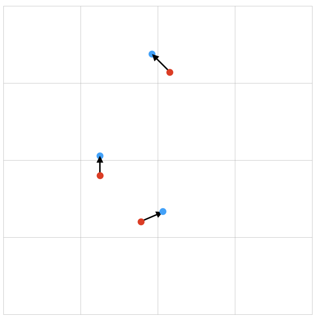 빨간점은 현재위치를 나타냅니다. 그리고, 파란점은 ‘intersectCellBoundary’를 사용하여 계산한 새로운 위치를 나타냅니다. 화살표는 반사 반직선의 방향을 나타냅니다.