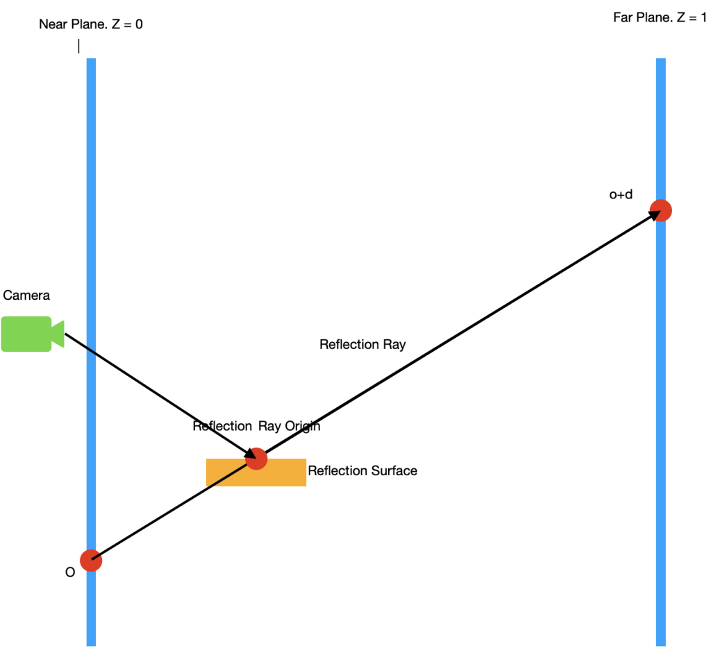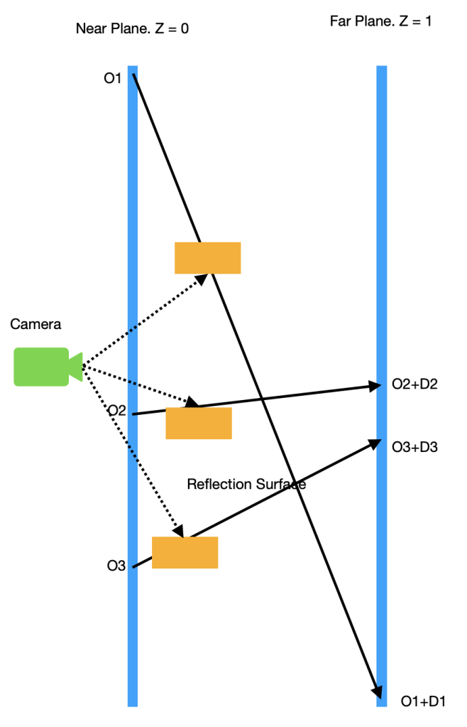 이 식을 사용하여, Depth가 0일때, 반직선은 ‘o’이 되고 Depth가 1일 때, 반직선은 (o+d)가 됩니다. 반직선의 원점을 얻기 위해, 우리는 반직선의 원점에 Depth를 연결해야 합니다(다른 말로, 현재 샘플의 Depth).