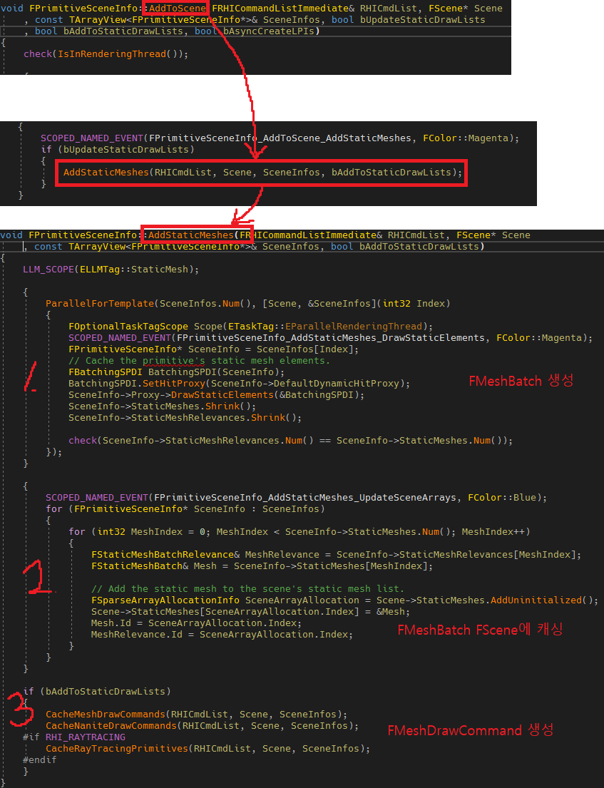 다시 방금 전 본 FPrimitiveSceneInfo::AddToScene로 갑니다. 그 안에서 AddStaticMeshes 함수를 호출하는데요. 이 함수에서 이름 그대로 StaticMesh에 대해 FMeshBatch와 FMeshDrawCommand를 만들어 줍니다. 그리고 이 두 가지 정보는 변경이나 소멸이 되기 전까지는 계속 캐싱해둡니다.