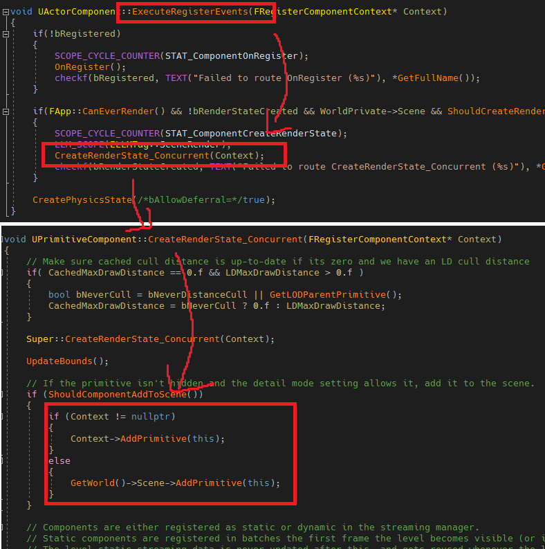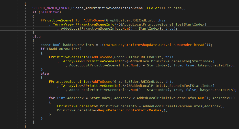 이 함수는 간단히 AddedPrimitiveSceneInfos에 새로 생성된 FPrimitiveSceneInfo를 등록하고 끝냅니다. AddedPrimitiveSceneInfos는 등록 예정 중인 FPrimitiveSceneInfo의 Queue라고 생각하면 됩니다. 그렇다면 실제 등록은 다른 곳에서 이루어진다는 것인데 어디인지 계속해서 알아봅시다.