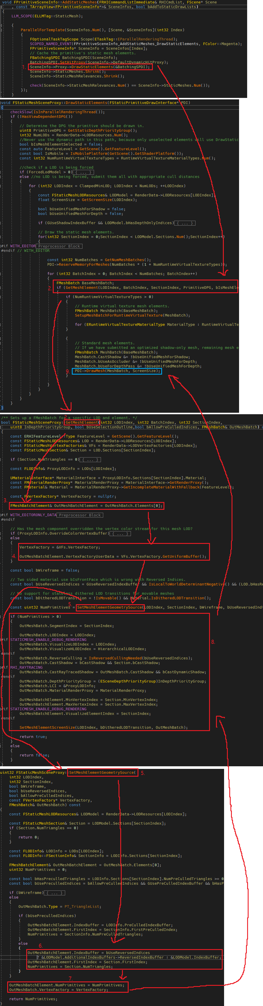 5. StaticMesh의 경우 CachedDrawLists에 FMeshDrawCommand를 캐싱해두며, 가시성 검사만 한 뒤 이미 만들어둔 FMeshDrawCommand를 그대로 렌더링 하는 데 사용합니다.