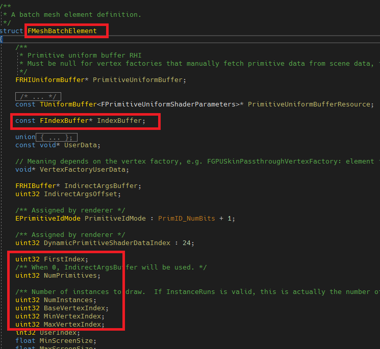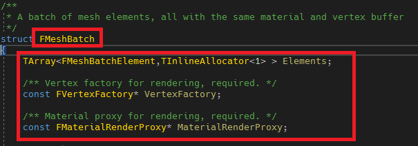시작하기 전 FMeshBatch의 구조를 한번 보도록 합니다. FMeshBatch는 주석의 설명 그대로 같은 머터리얼과 버택스 버퍼를 사용하는 메시 요소들을 갖고 있는 객체입니다.