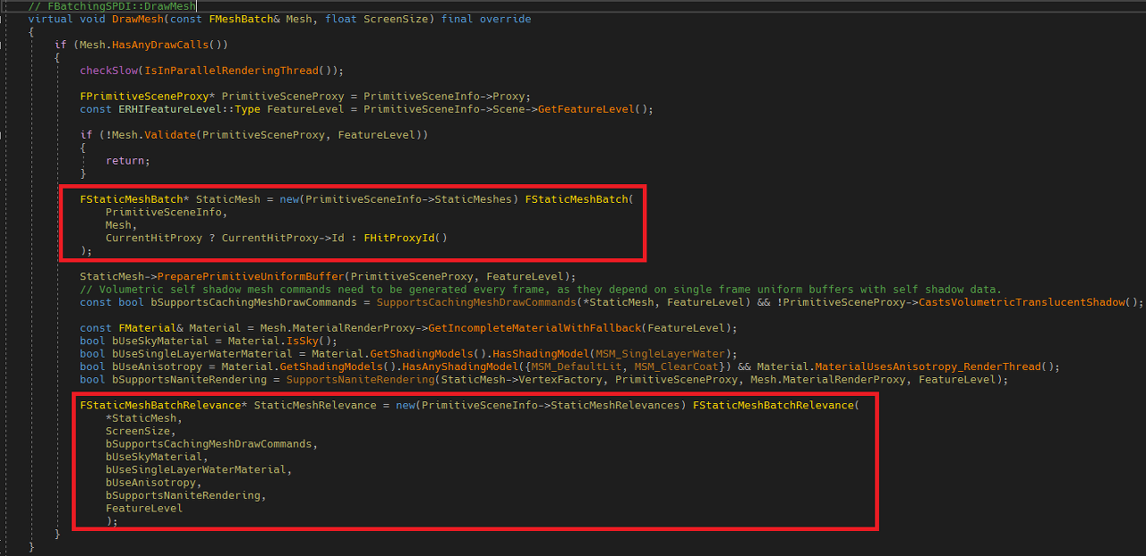 [1]. FStaticMeshBatch(FMeshBatch)를 생성하고 FPrimitiveScneneInfo의 StaticMeshes에 캐싱