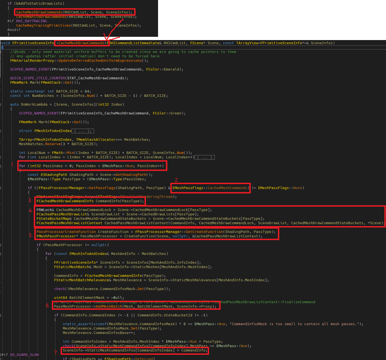 3. FCachedMeshDrawCommandInfo는 FPrimitiveSceneInfo->StaticMeshCommandInfos 배열에 추가되며 FPrimitiveSceneInfo가 FScene에 캐싱된 FMeshDrawCommand를 찾을 때 사용합니다.