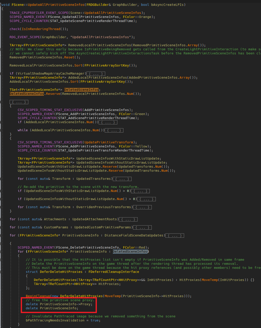FPrimitiveSceneInfo의 등록은 FScene::UpdateAllPrimitiveSceneInfos 이 함수에서 처리합니다. 이 함수는 모든 렌더링이 시작되는 FDeferredShadingSceneRenderer::Render 함수가 호출되기 전 항상 먼저 불립니다. 이 함수는 추가 예정, 삭제 예정, 수정 예정인 FPrimitiveSceneInfo들을 처리합니다.