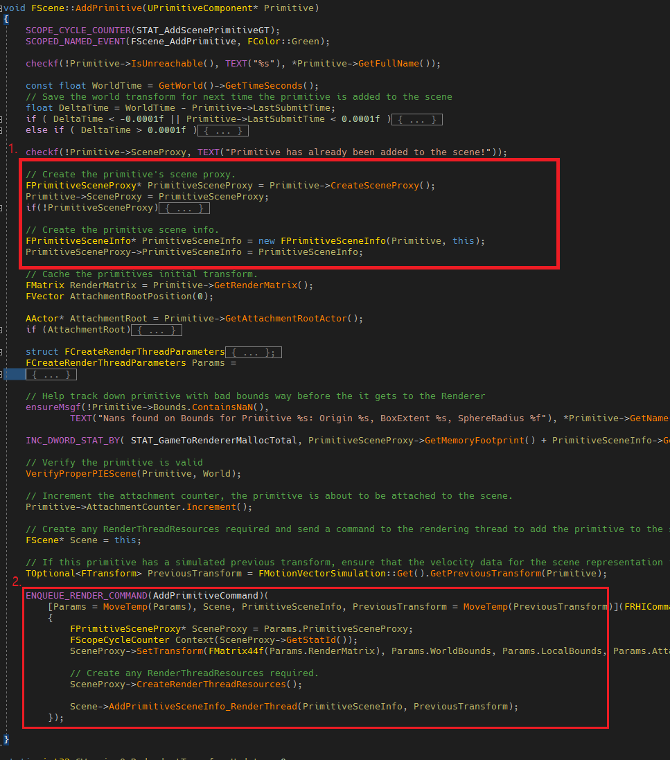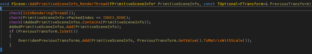 AddPrimitiveSceneInfo_RenderThread는 _RenderThread라는 이름이 붙어있는데, 언리얼에서 이런 이름은 렌더스레드에서 호출되길 기대한다는 의미입니다.