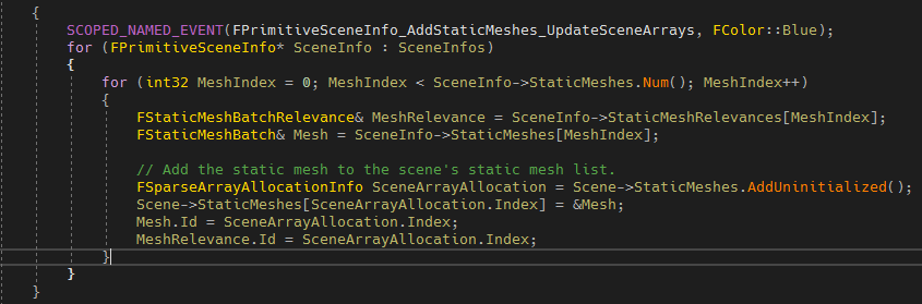 [2]. 전 단계에서 만든 FMeshBatch를 FScene의 StaticMeshes 넣고 이 배열에서의 인덱스를 FMeshBatch와 FStaticMeshBatchRelevance의 Id 멤버에 등록
