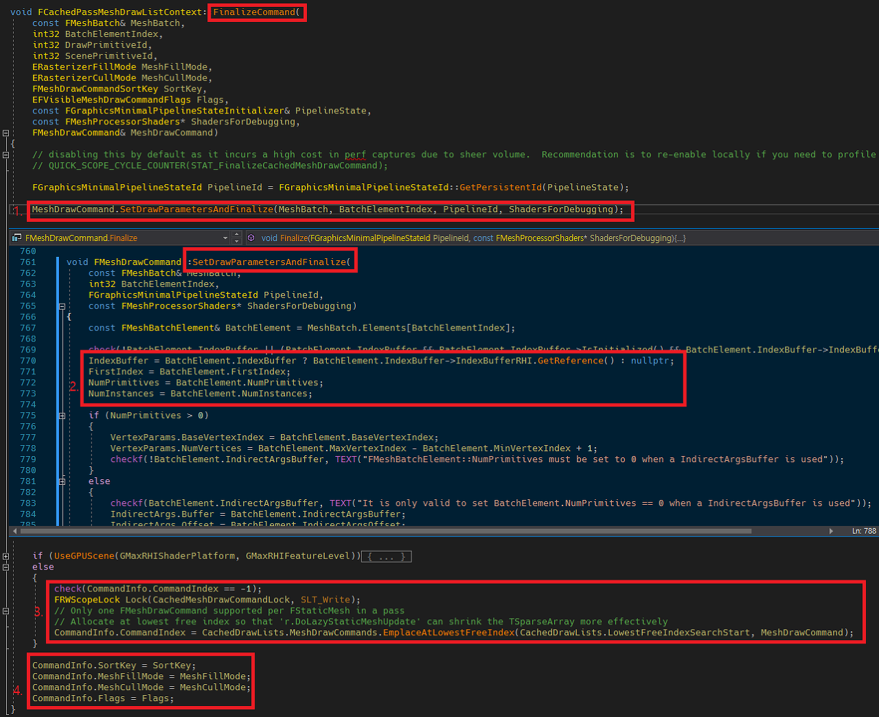 SharedMeshDrawCommand를 만드는 부분과 SharedMeshDrawCommand를 템플릿으로 하여 각각의 FMeshBatchElement의 데이터를 설정하여 FMeshDrawCommand를 FScene에 실제로 캐싱하는 부분입니다.