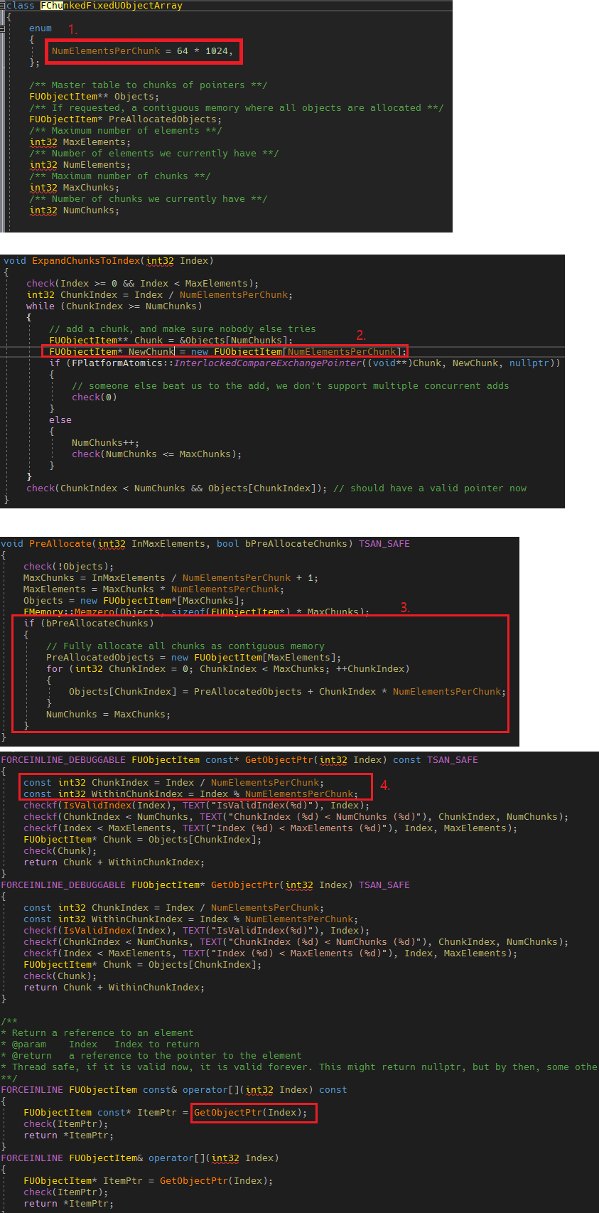 1. 이 배열은 FUObjectItem을 순회할 때 캐시 효율을 올리기 위해서 64 * 1024 개 단위로 FUObjectItem 배열을 확장합니다.