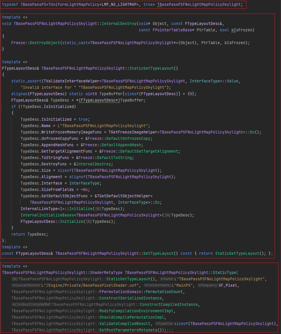 TBasePassVS는 LightMapPolicy에 따라서 템플릿 클래스가 생성되는 것을 확인할 수 있습니다. 하지만 이 부분은 무시하셔도 됩니다. 저희는 FShaderType과 FShader의 관계에 더 집중하겠습니다.