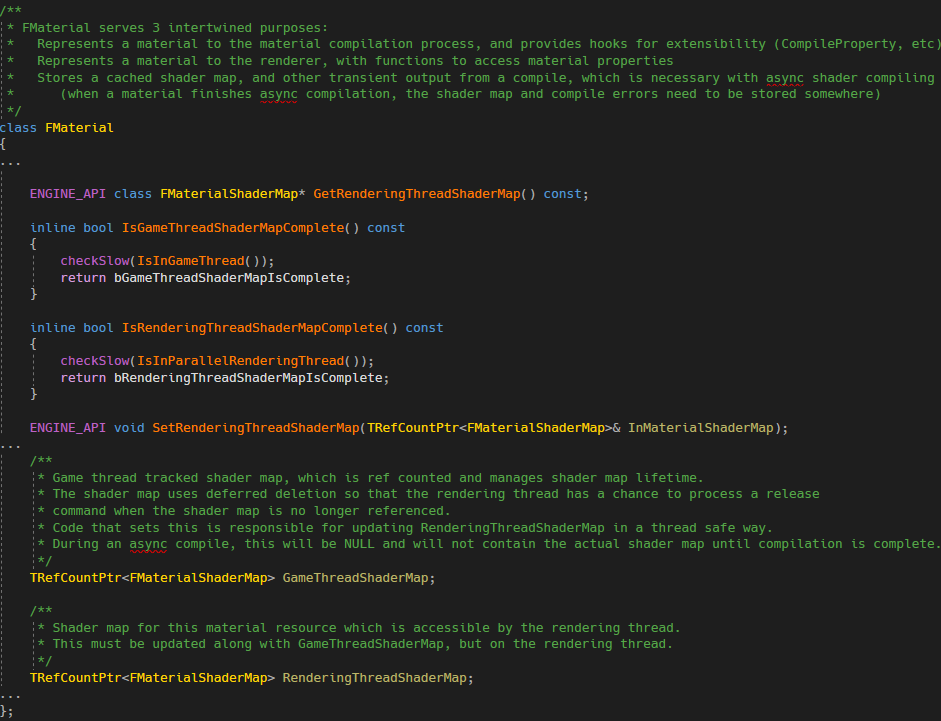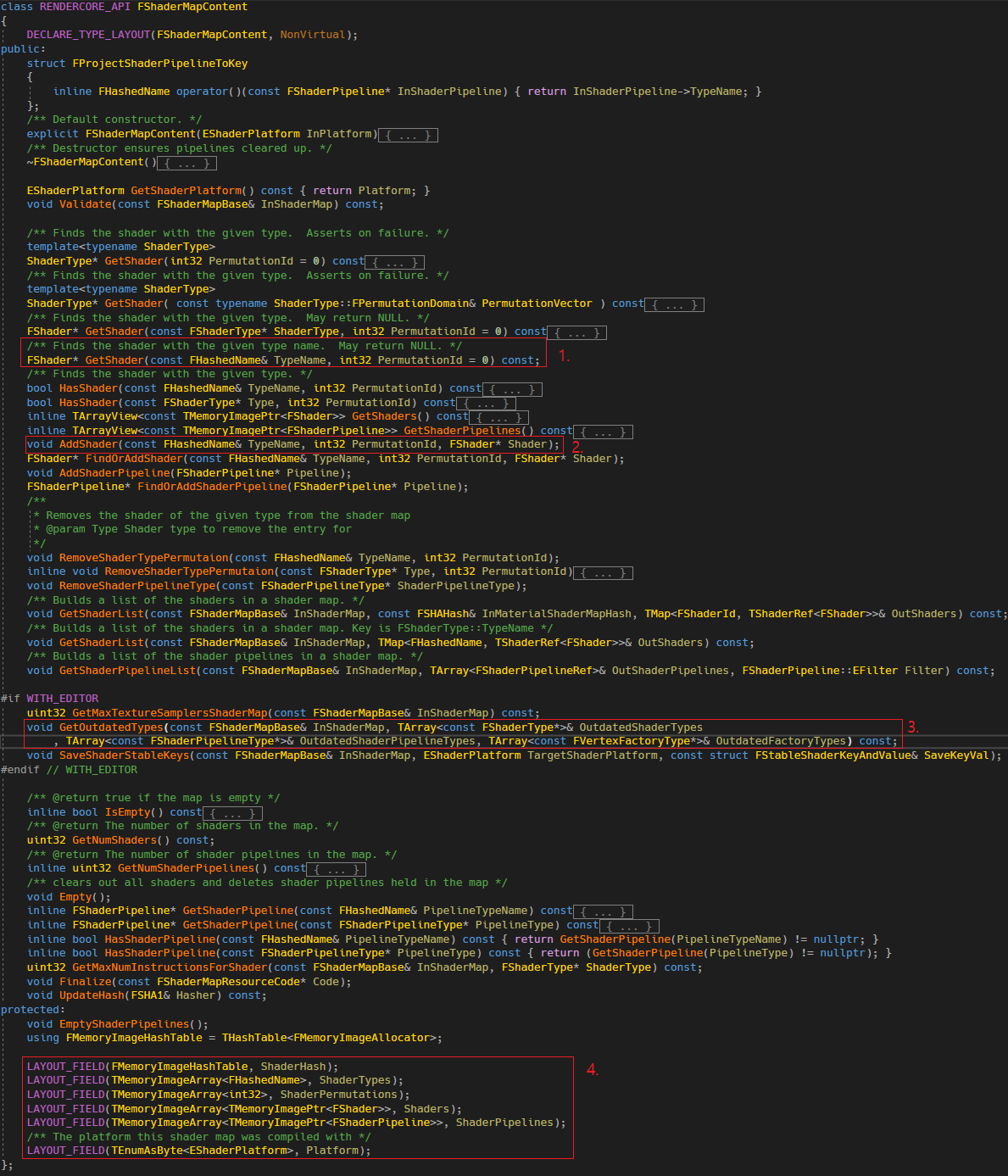- FMaterial가 소유하고 있는 ShaderMap입니다. 이 FMaterial에 접근이 가능하면 Material을 통해 조합된 모든 쉐이더에 접근 가능합니다.