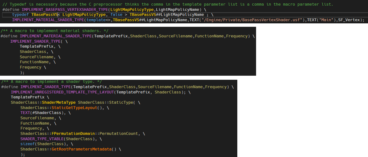 1. 이 매크로는 FShaderType을 선언하는 부분입니다. 이 매크로를 보면 TBasePassVS는 MeshMaterial 타입이라는 것을 알 수 있습니다. 이 매크로의 확장은 그림3에 있습니다. 이 매크로는 짝이 되는 매크로가 있는데요. IMPLEMENT_SHADER_TYPE 입니다. 뒤에 계속해서 볼 예정입니다.