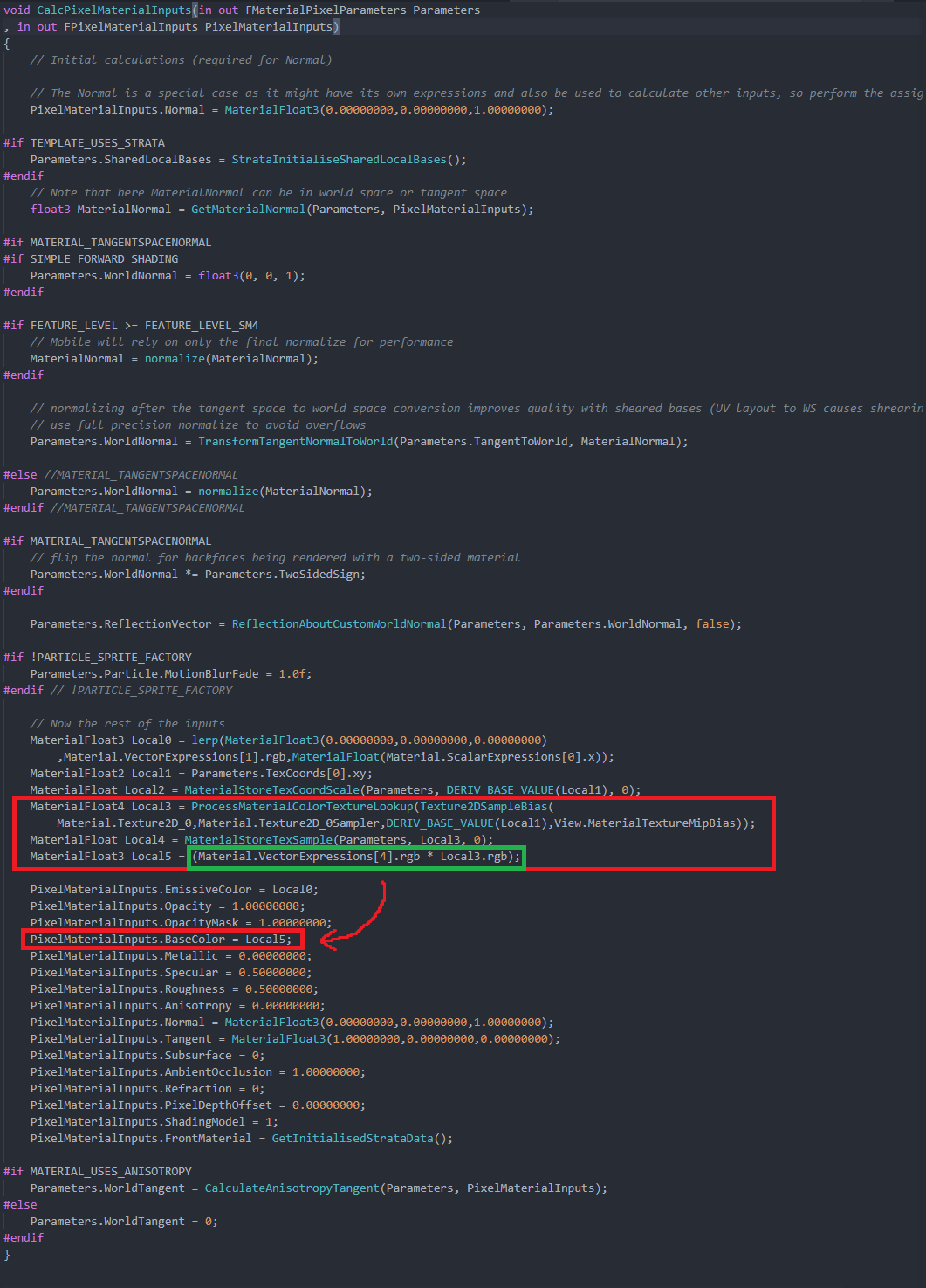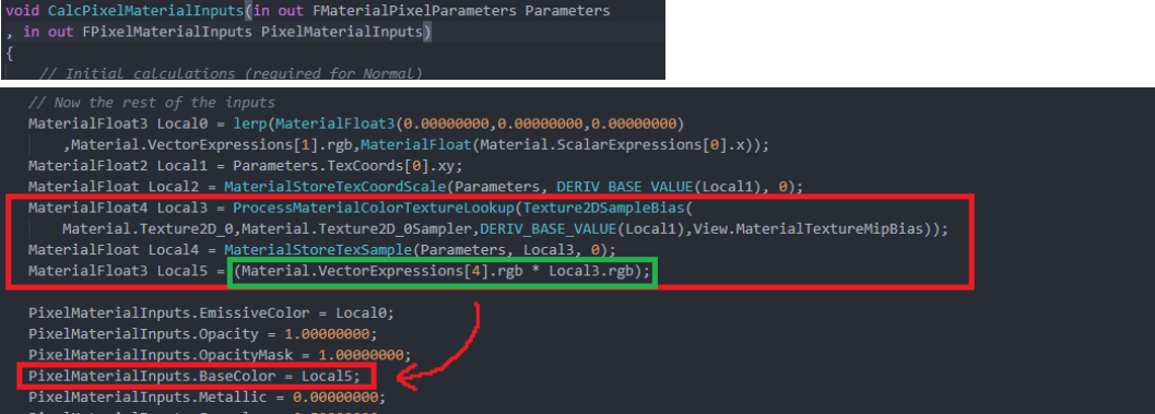 아래의 빨간색 네모 부분이 BaseColor 부분을 위해 노드로부터 쉐이더 코드로 생성된 부분입니다. 그중 초록색 네모 부분이 마지막으로 Color와 Texture를 Multiply 하는 부분입니다. Color들끼리의 Multiply 부분은 없는데요. 이 부분은 Material.VectorExpressions[4].rgb로 대체되었네요. 이 부분은 이후에 컴파일 과정을 보면서 어떻게 생성되었는지 알아봅시다.