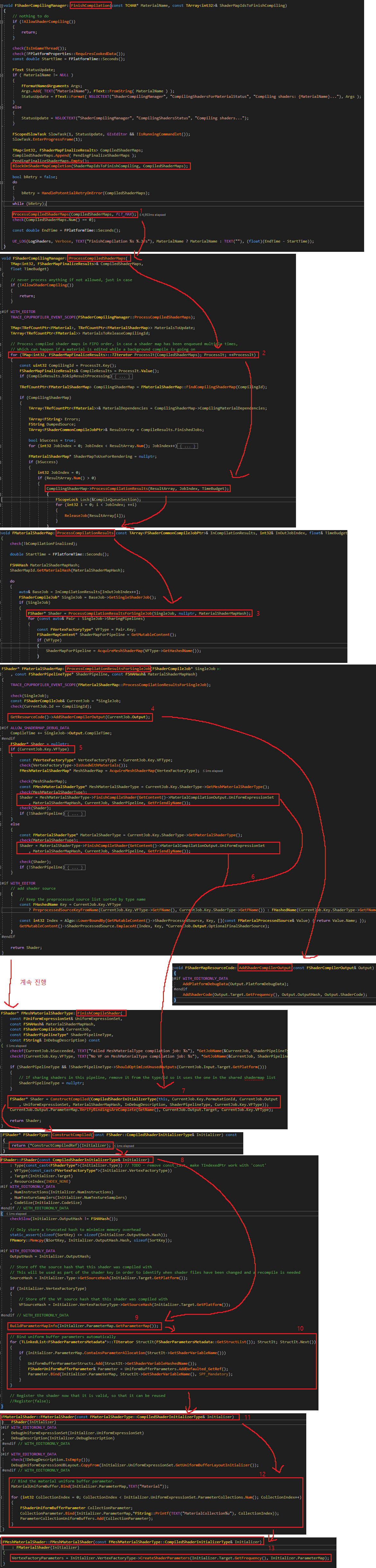 2. 컴파일된 모든 ShaderMap 에 대하여 ProcessCompilationResults를 호출합니다.