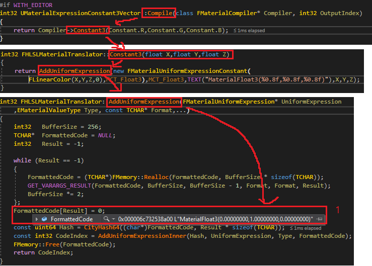 3. FMaterialUniformExpressionFoldedMath가 Material.VectorExpressions[4].rgb로 변환됩니다. 이 VectorExpression[4]는 Uniformbuffer를 통해 쉐이더 외부에서 설정해줍니다. 그렇다면 노드의 일부 평가는 CPU에서 된다는 뜻입니다.