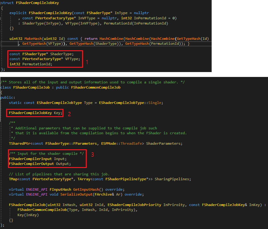1. MeshMaterialShader의 경우 Layout.MeshShaderMap에 저장했습니다. 먼저 MeshMaterialShader에 대해서 컴파일을 수행합니다. FMeshMaterialShaderMap은 FMaterialShaderMap에 있으며, FVertexFactoryType을 Key로하여 FMaterialShaderMap로 부터 FMeshMaterialShaderMap을 얻을 수 있습니다.