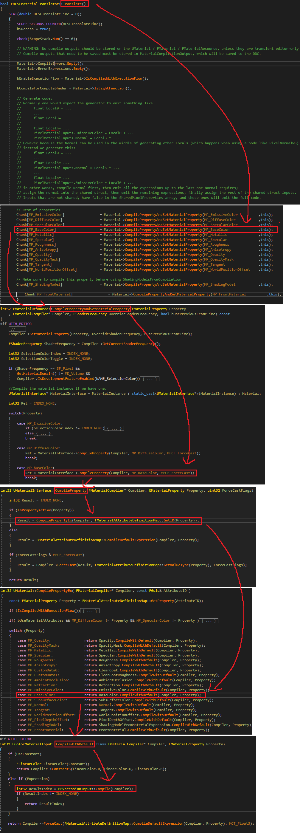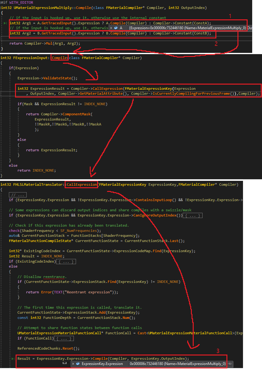 여기까지가 쉐이더 컴파일 과정의 끝입니다. 마지막으로 쉐이더 컴파일 과정 설명중 추가로 알아보기로 한 CPU에서 계산하는 Material Editor 노드 연산을 알아봅시다.