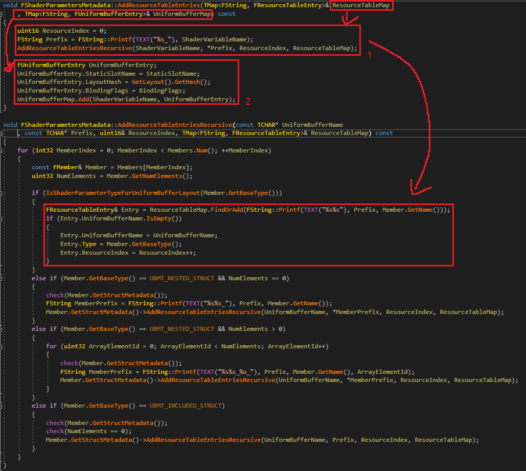 6. FShaderParametersMetadata->AddResourceTableEntries를 호출합니다. FShaderParametersMetaData는 UniformBuffer의 리플렉션 타입입니다. 이 FShaderType이 소유하는 모든 UniformBuffer에 대해서 ResourceIndex를 붙여줍니다. UniformBuffer 에 다른 UniformBuffer 가 포함되어 있으면 그것들을 또한 모두 ResourceIndex 를 붙여줍니다. UniformBuffer 가 가진 모든 ResourceIndex를 0~N 까지 모두 붙여 ResoureceTable에 저장합니다. 그리고 개개별의 UniformBuffer는 UniformBufferMap에 FUniformBufferEntry로 추가해줍니다. 그림35 에 AddResourceTableEntries 의 구현을 볼 수 있습니다.