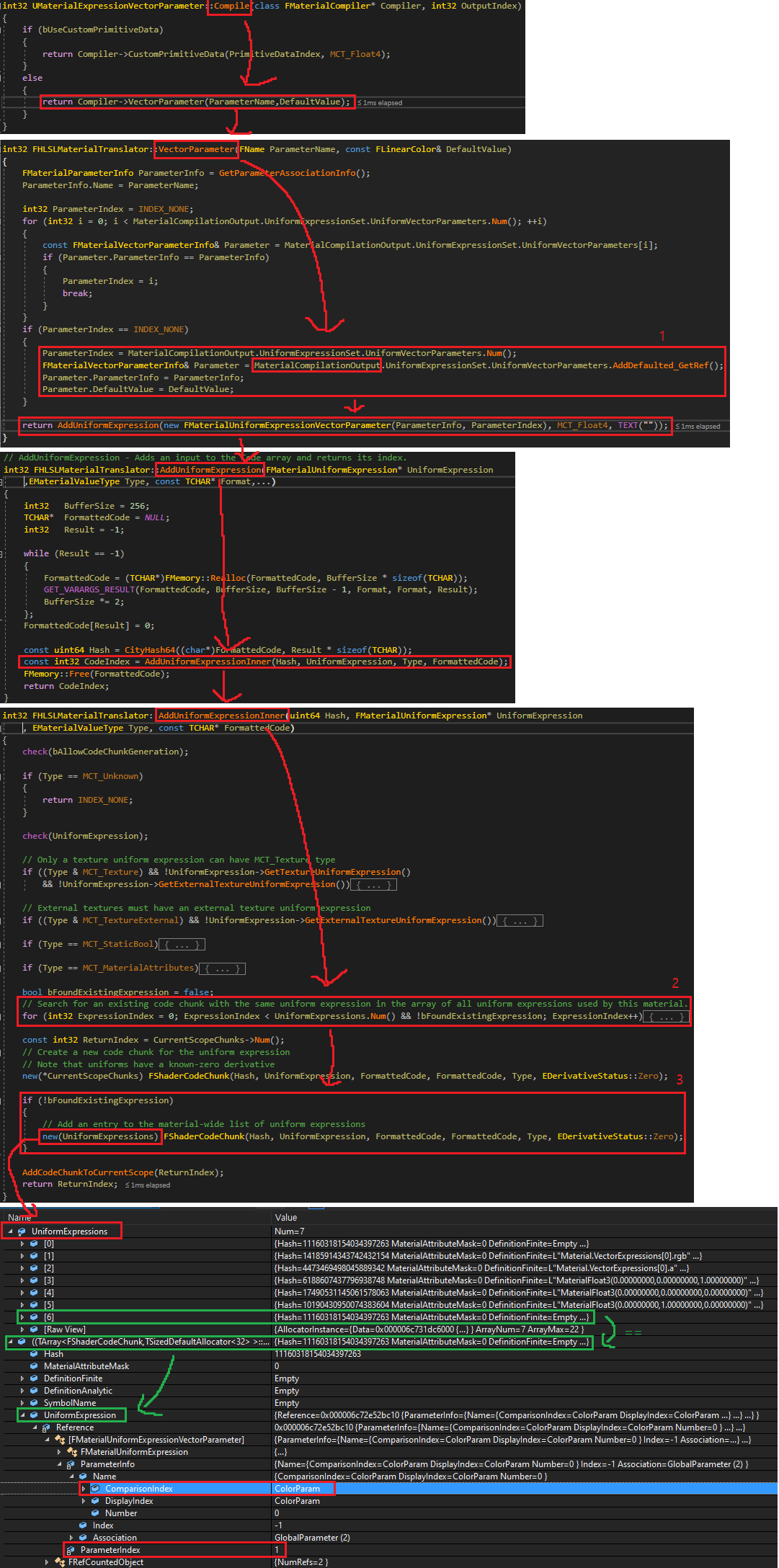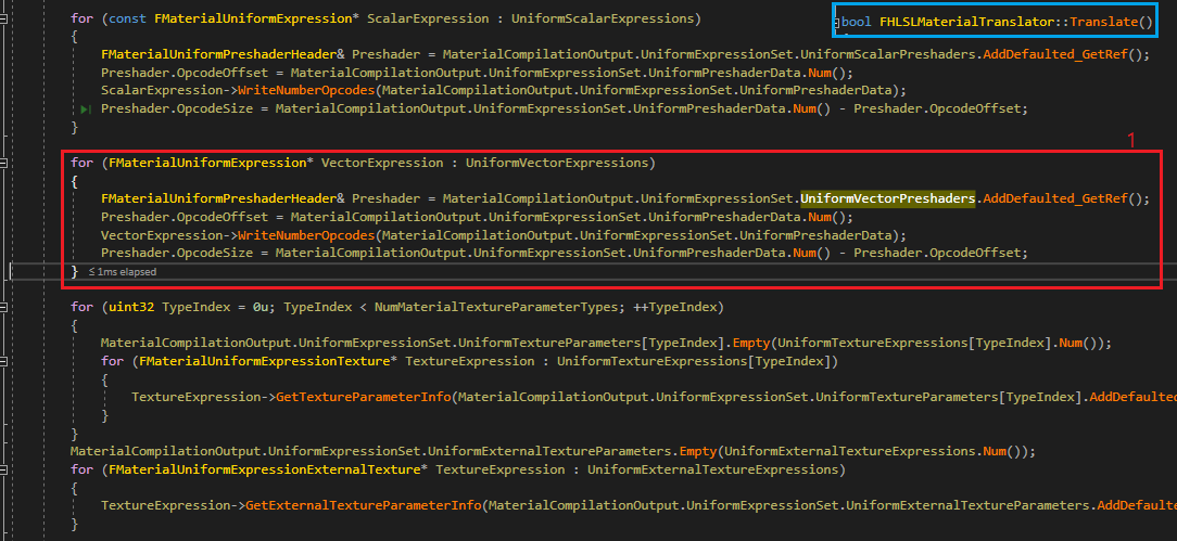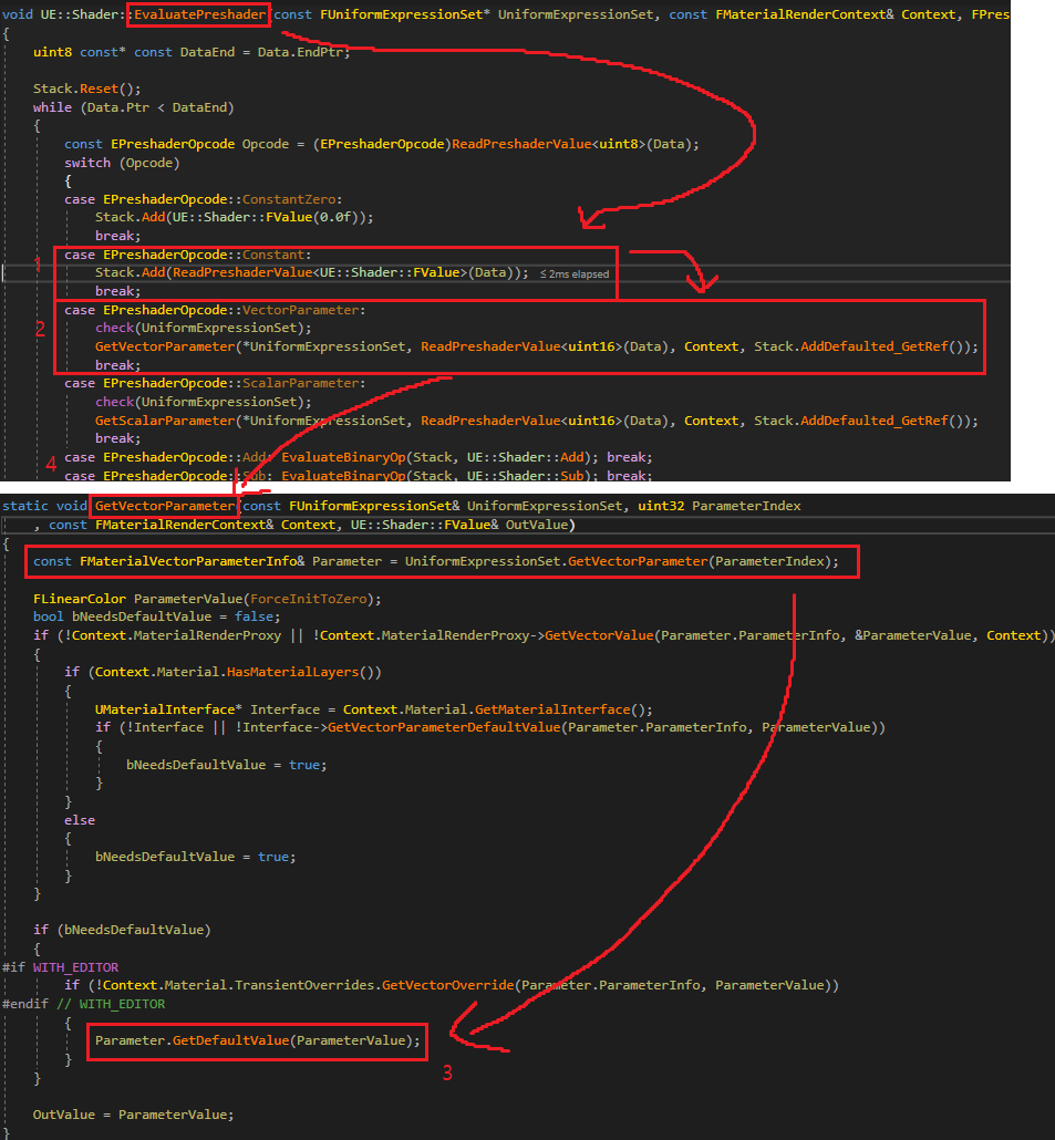 1. MaterialCompilationOuput.UniformExpressionSet.UniformVectorPreshaders에 UniformVectorExpressions 정보를 넣습니다. 여기 들어간 것은 CPU 에서 평가합니다.